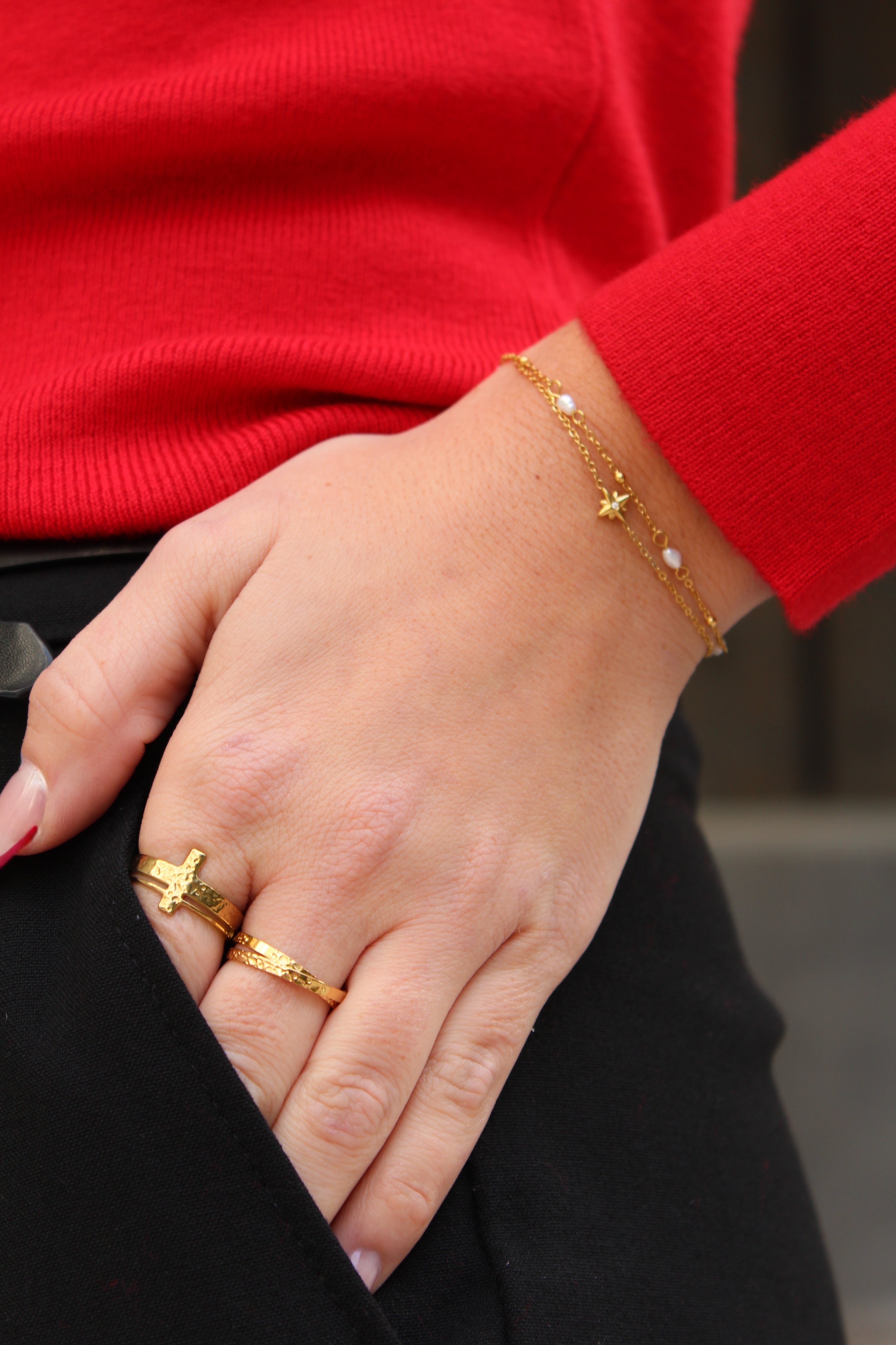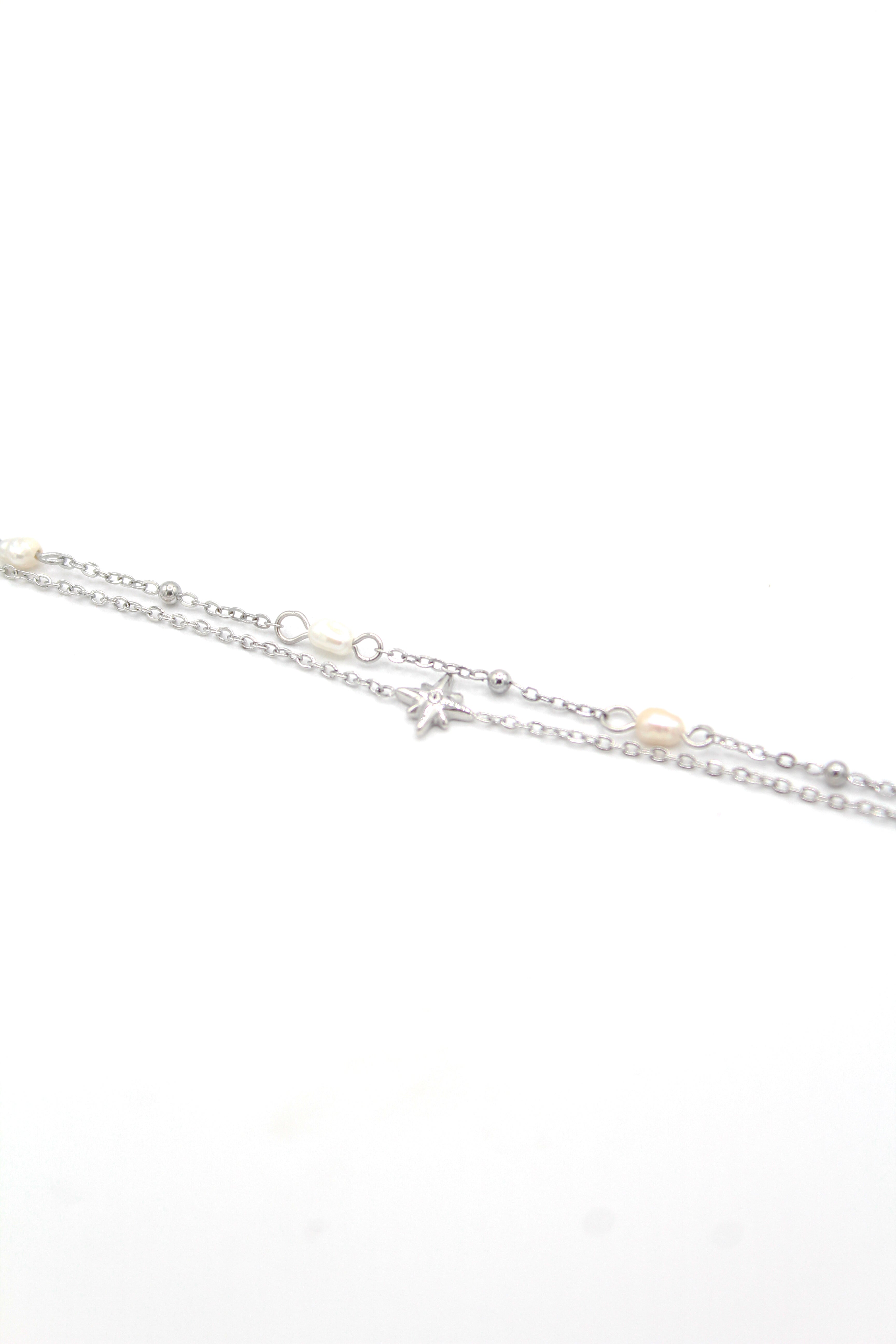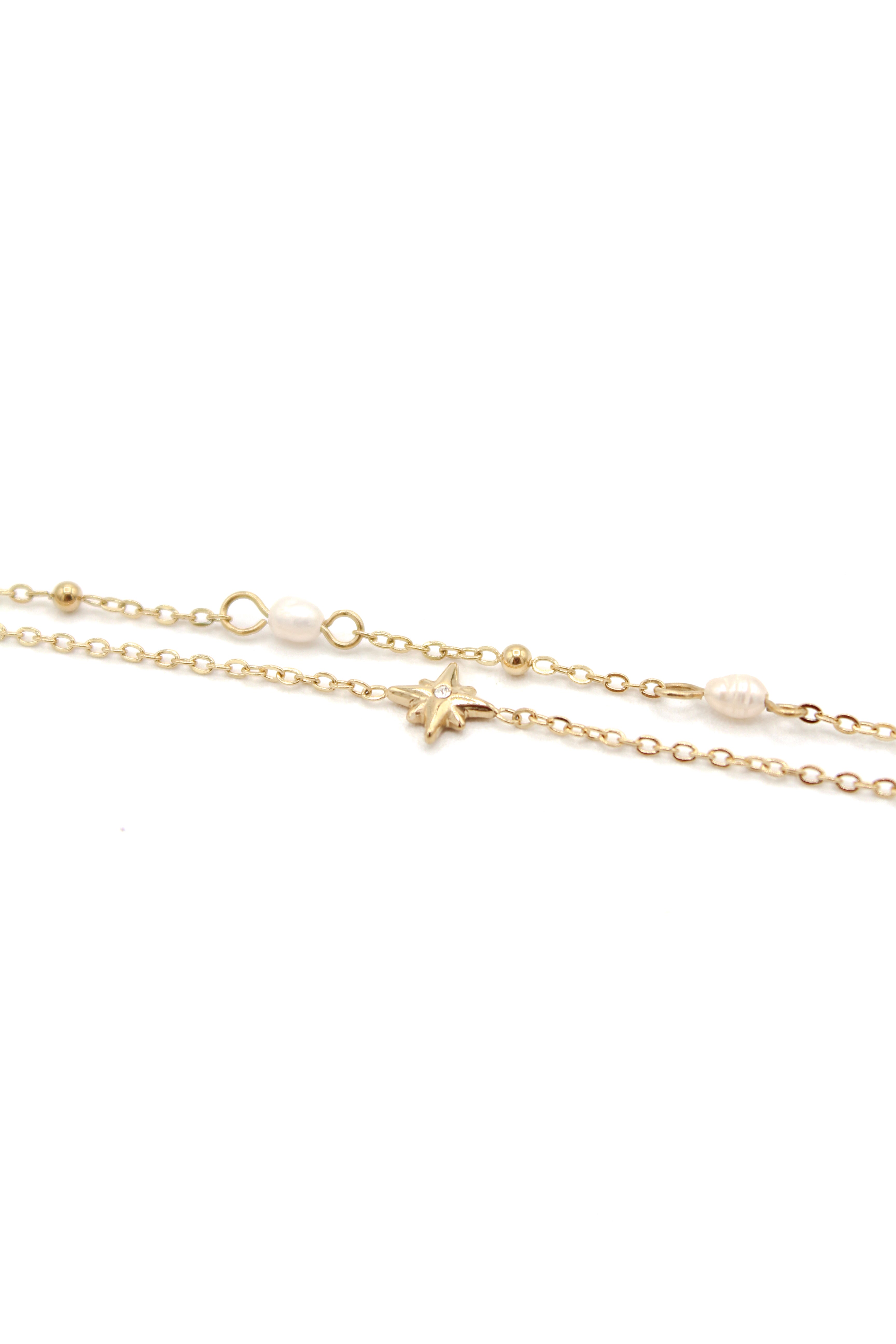 Bracelet en acier inoxydable composé de deux chaines. La première chaine est composée d'une étoile avec un strass et la deuxième de perles d'eau douce et de boules dorées.